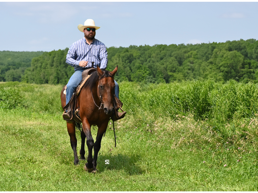 Houston is fantastic on the trails and will cross anything you put in front of him. He has crossed water, moved cattle through our dry lots, and has been ridden down the gravel around our farm. He has been through our desensitizing process with zero flaws. He has never offered to buck, bite, kick, or rear. There is alot of potential ahead for this sweet, quiet guy.